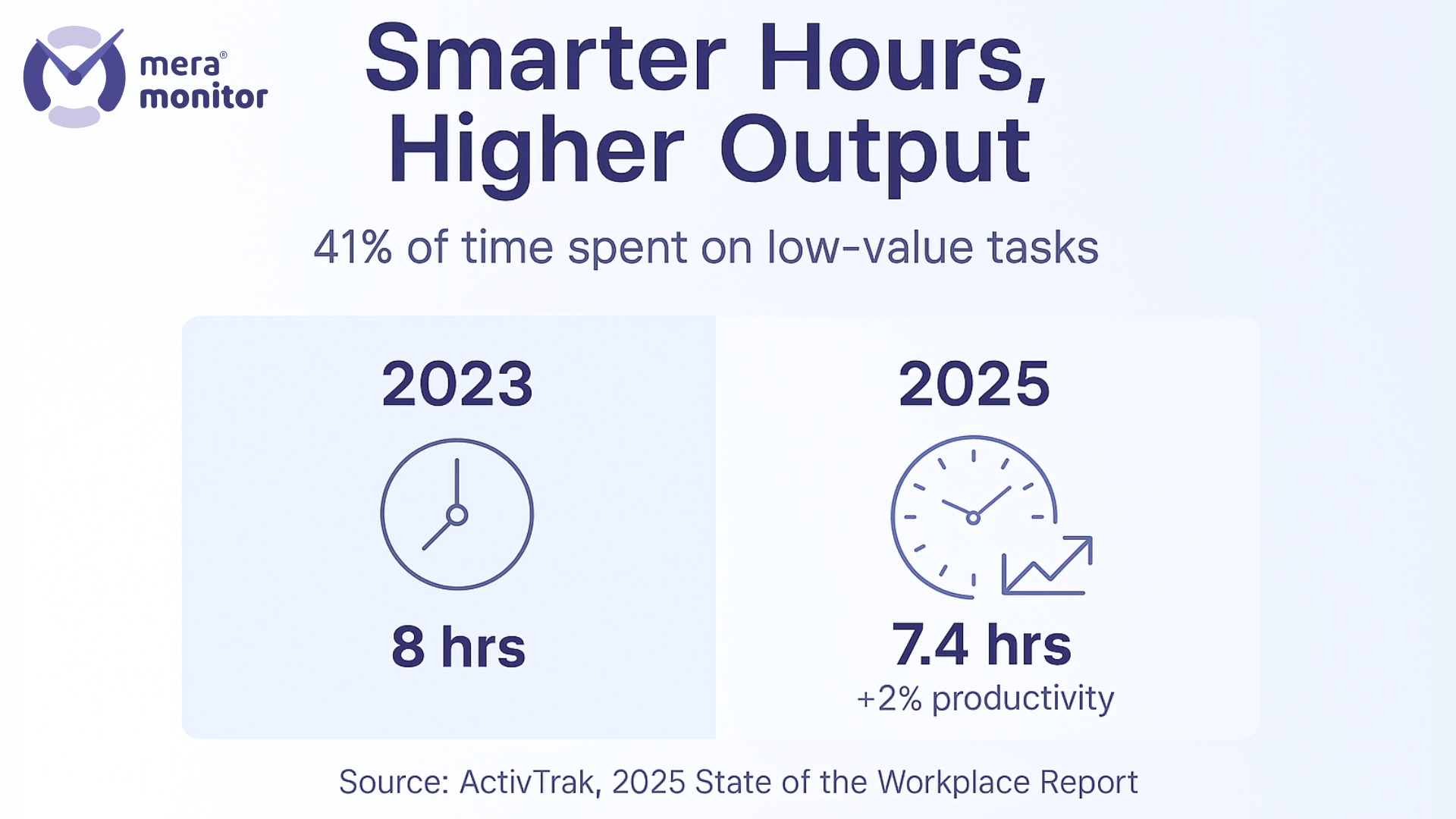 The hybrid and AI-driven era has also changed how we define “productive.” It’s no longer about clocking more hours — it’s about achieving consistent, high-quality results without exhausting your people. From the 2024-25 “State of the Workplace” report by ActivTrak, where average workday duration reduced by 7% (~36 minutes) yet productivity rose by 2%.